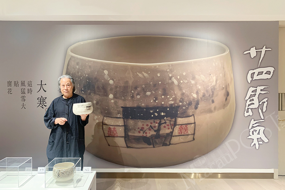 Water Poon Kwing-wing poses at The Grand Suites of The Four Seasons Hotel holding a bowl depicting the 24 Chinese solar terms – “Major Cold” (大寒).