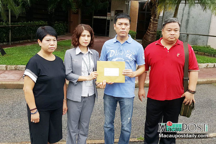 Members of the Macau Gambling Enterprises Staff Association (MGESA) including its secretary general Kelvin Choi Kam Fu (second from right) hand their petition to a Health Bureau (SSM) official (second from left) outside the bureau yesterday. Photo: MPDG