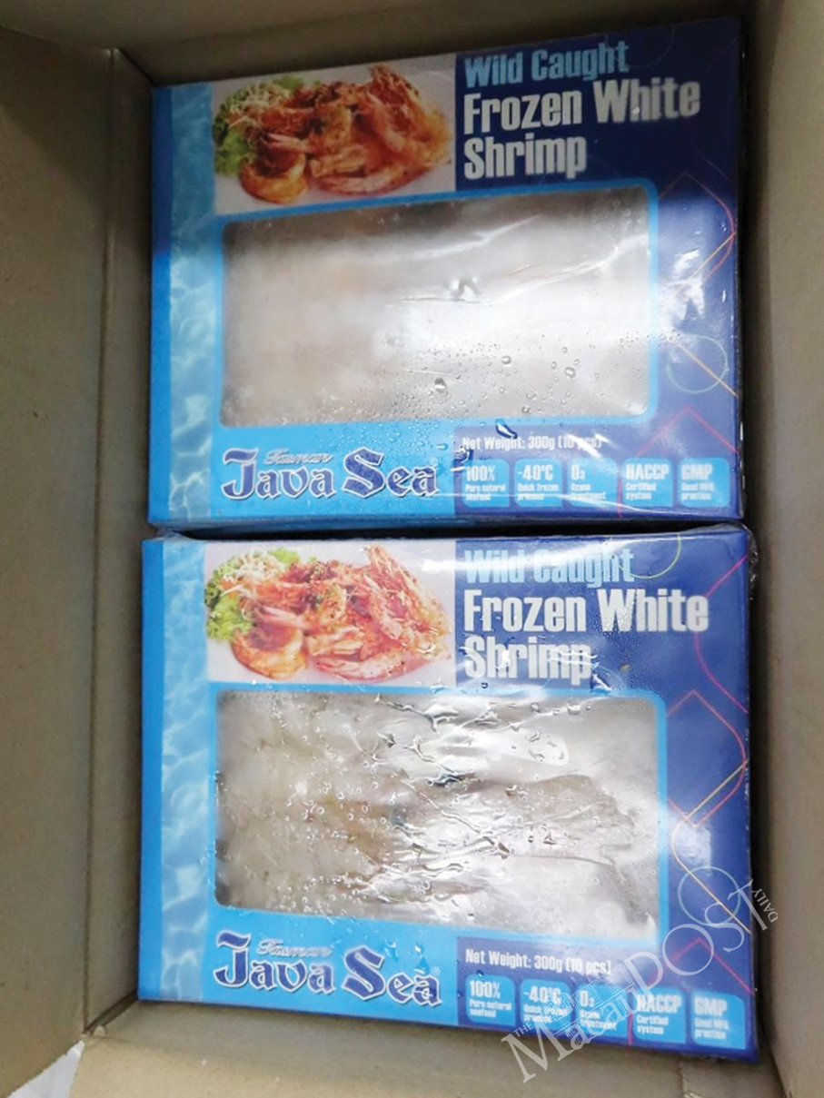 This undated handout photo provided by the Municipal Affairs Bureau (IAM) yesterday shows two small boxes of frozen shrimp in a large box.