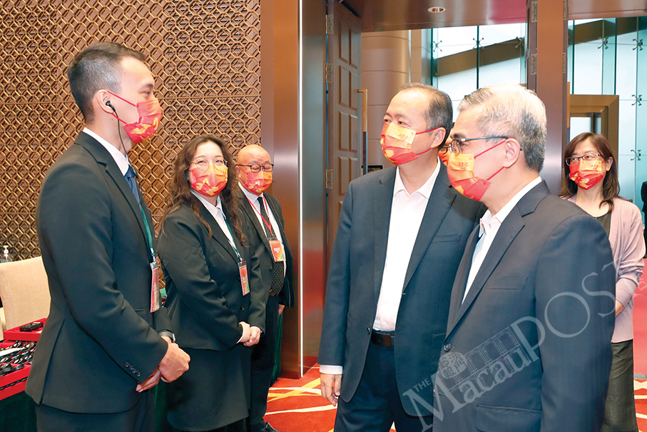 Liaison Office of the Central People’s Government in the Macau Special Administration Region (MSAR) Deputy Director Zheng Xincong (second from right) and Secretary for Security Wong Sio Chak (first from right) visit the National Security Education Exhibition last night to greet the exhibition’s staff members . Photo: Government Information Bureau (GCS)