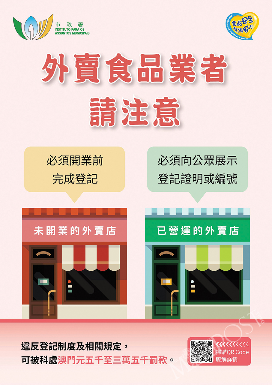 This poster recently provided by the Municipal Affairs Bureau (IAM) reminds the public that takeaway shops are required to obtain a registration certificate and display the registration on their premises.