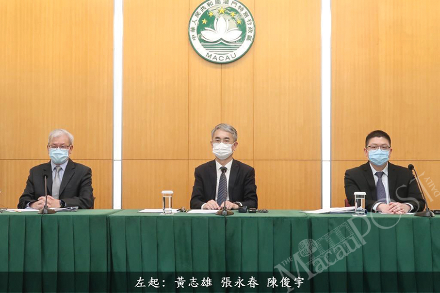 Secretary for Administration and Justice André Cheong Weng Chon (centre), Labour Affairs Bureau (DSAL) Director Wong Chi Hong (left) and DSAL Deputy Director Chan Chon U address Friday’s Executive Council press conference at Government Headquarters. Photo courtesy of TDM