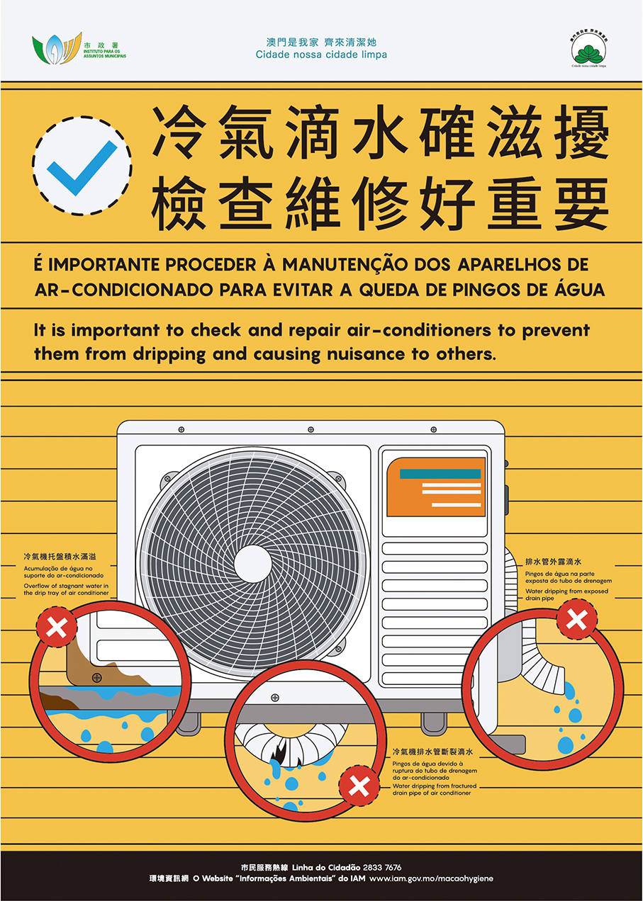 This poster provided by the Municipal Affairs Bureau (IAM) shares the bureau’s message on the importance of preventing air conditioners from dripping.