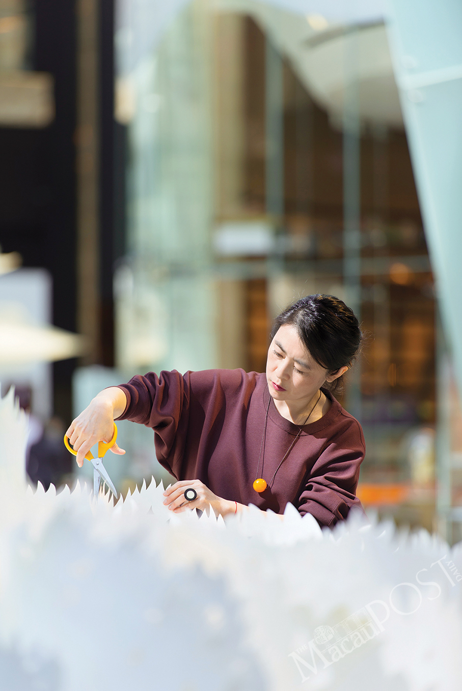 The statement said that “change” is the art piece’s core message. It also incorporates the Five Elements mentioned in the Book of Rites that describe the rotation of seasons, with Wen depicting the theme with two sets of paper sculptures: “Spring and Summer”, which symbolises “fresh revival of liveliness with hints of tender greens, pinks and reds”, while the “Autumn and Winter” set “coats the atrium with darker hues with sparkles of silver to mimic the calm, snowy hills during the chilly days”, the statement pointed out.