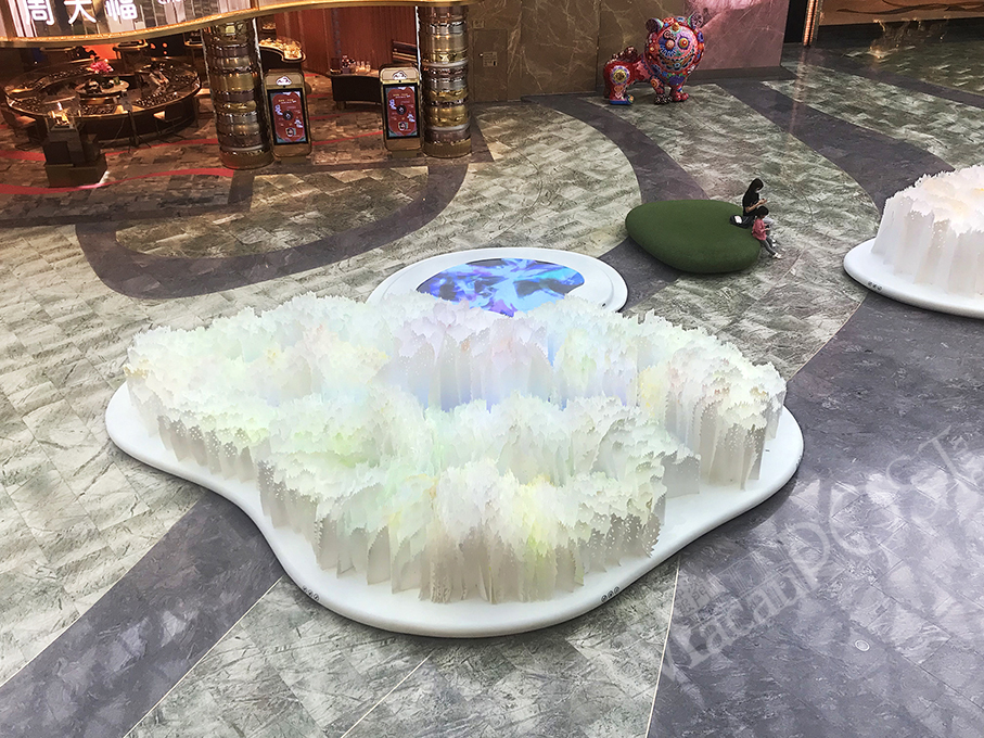 The statement added that the sculptural garden in the form of three islands is inspired by Macau’s geographic composition and has been made to be “a site-specific work that integrates seamlessly into the public space of the Spectacle”. Next to the islands are what Wen referred to as “digital ponds”. Both the islands and the ponds have LED panels as their bases, which the statement said reflects “coloured beams that change along the dynamics of nature”.