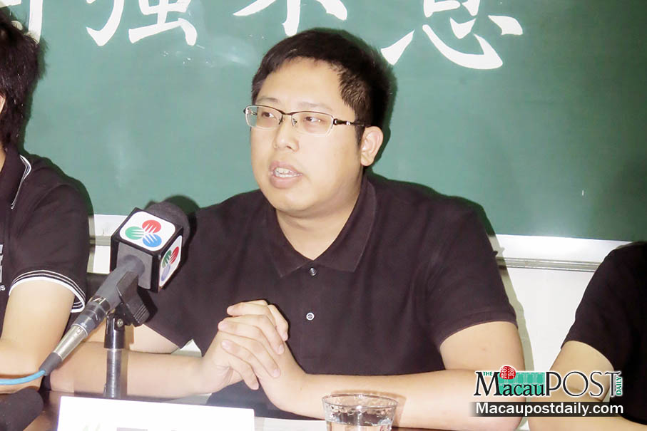 Macau Concealers Director Jason Chao Teng Hei yesterday talks to reporters during a press conference at the New Macau Association (NMA) office in Calçada de Santo Agostinho. Photo: Angus Wu