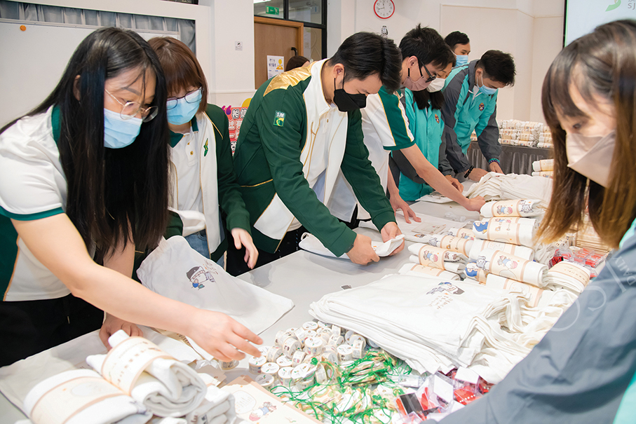 This undated handout picture provided by SJM Resorts yesterday shows SJM staff and Sheng Kung Hui Choi Kou Macau Social Services Coordination Office packing “5 Gifts of Happiness” canvas bags.