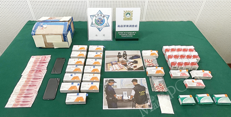 According to Leng, Macau Customs Service and PJ officers recently found a suspicious package containing psychoactive drugs during the checking of parcels from overseas at the customs post in the Inner Harbour, so the Customs Service and Judiciary Police launched a joint operation.