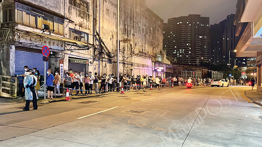 People queue for their mandatory and free nucleic acid tests (NATS) outside Patane Market Municipal Complex last night. Photo: Maria Cheang Ut Meng