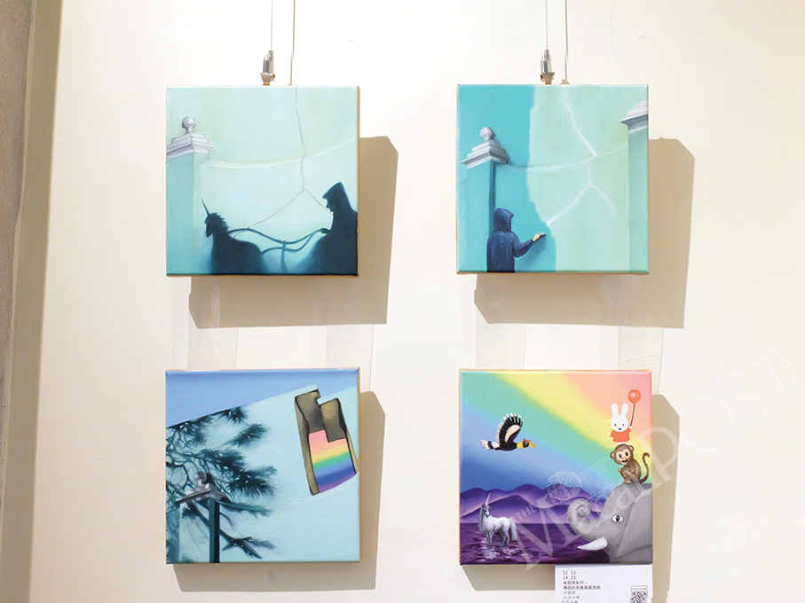 Artists Carol Sam (岑麗嫦) and Celia Si (施明珠) are showcasing their works in an exhibition titled “Embrace the Rainbow – Hey! Let us talk again after the pandemic” in room C03 of the 10 Fantasia gallery, which aims to share “infinite hope and positive energy”.