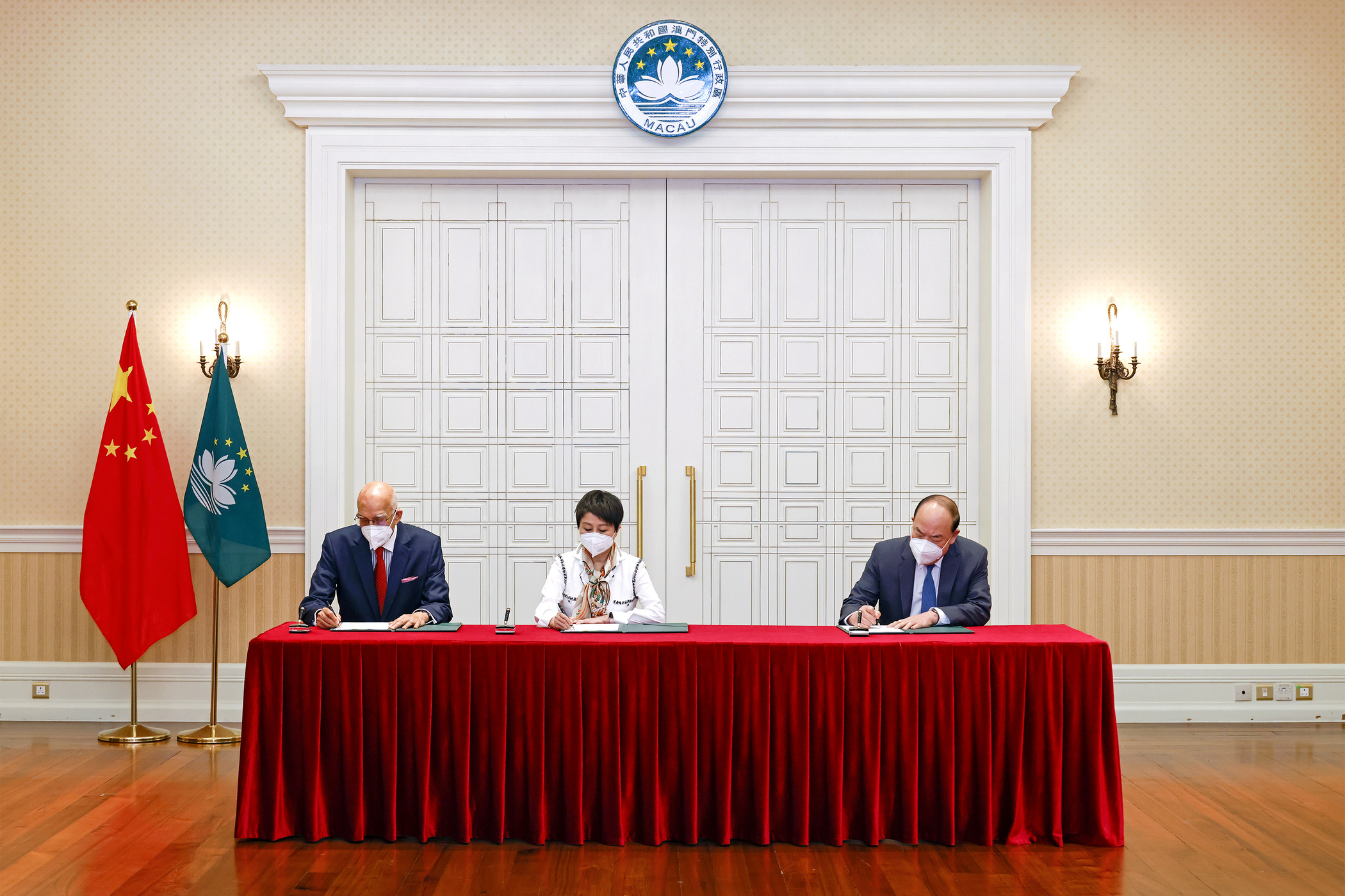 This handout photo provided by the Macau Government Information Bureau (GCS) shows Chief Executive Ho Iat Seng (right) signing the concession amendment agreement with SJM representatives Angela Leong On Kei (centre) and Rui Cunha.