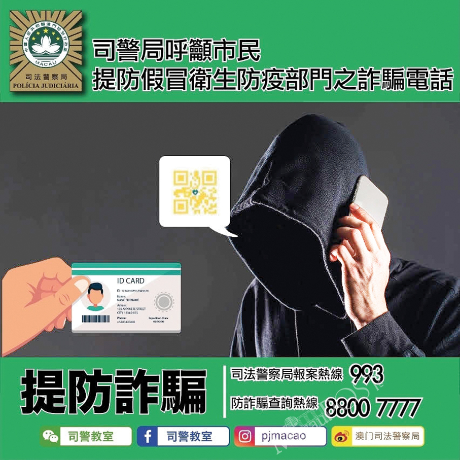 The statement noted that since there are criminals trying to defraud people in Macau by taking advantage of the novel coronavirus pandemic or other livelihood issues of public concern, the Judiciary Police are urging the public to be wary of such phone scams, where the callers request the victims to provide their personal data, such as their home address, ID card and bank account numbers, adding that residents should immediately hang up after receiving such calls, in order to avoid any loss.