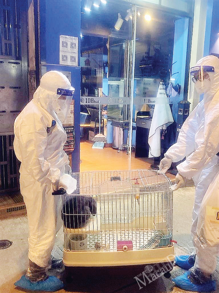 This undated handout photo provided by the Municipal Affairs Bureau (IAM) on Friday shows officials carrying a pet in a cage.
