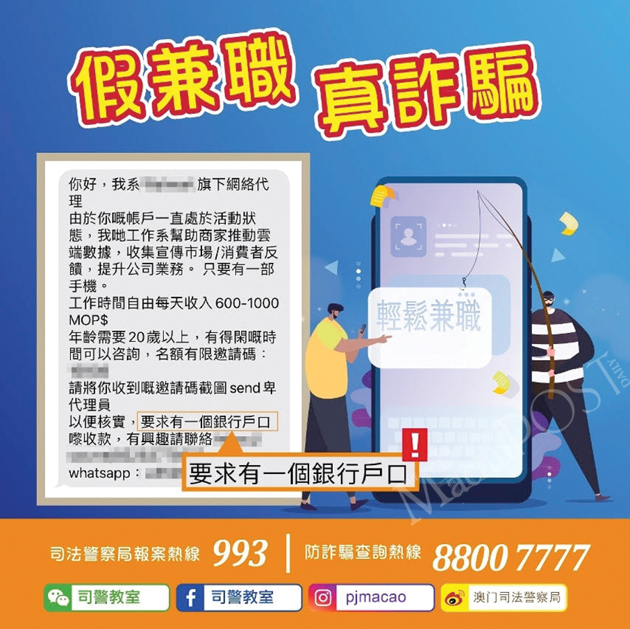This poster provided by the Judiciary Police (PJ) on Sunday warns the public to be wary of suspicious recruitment text messages.