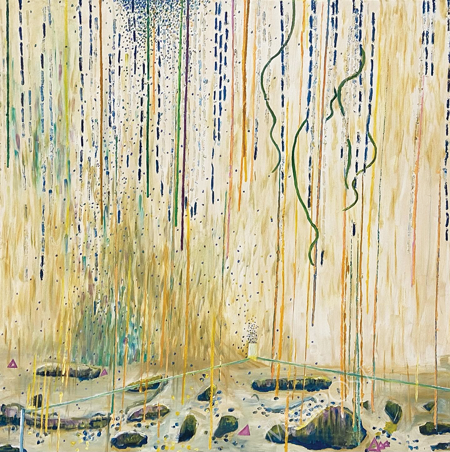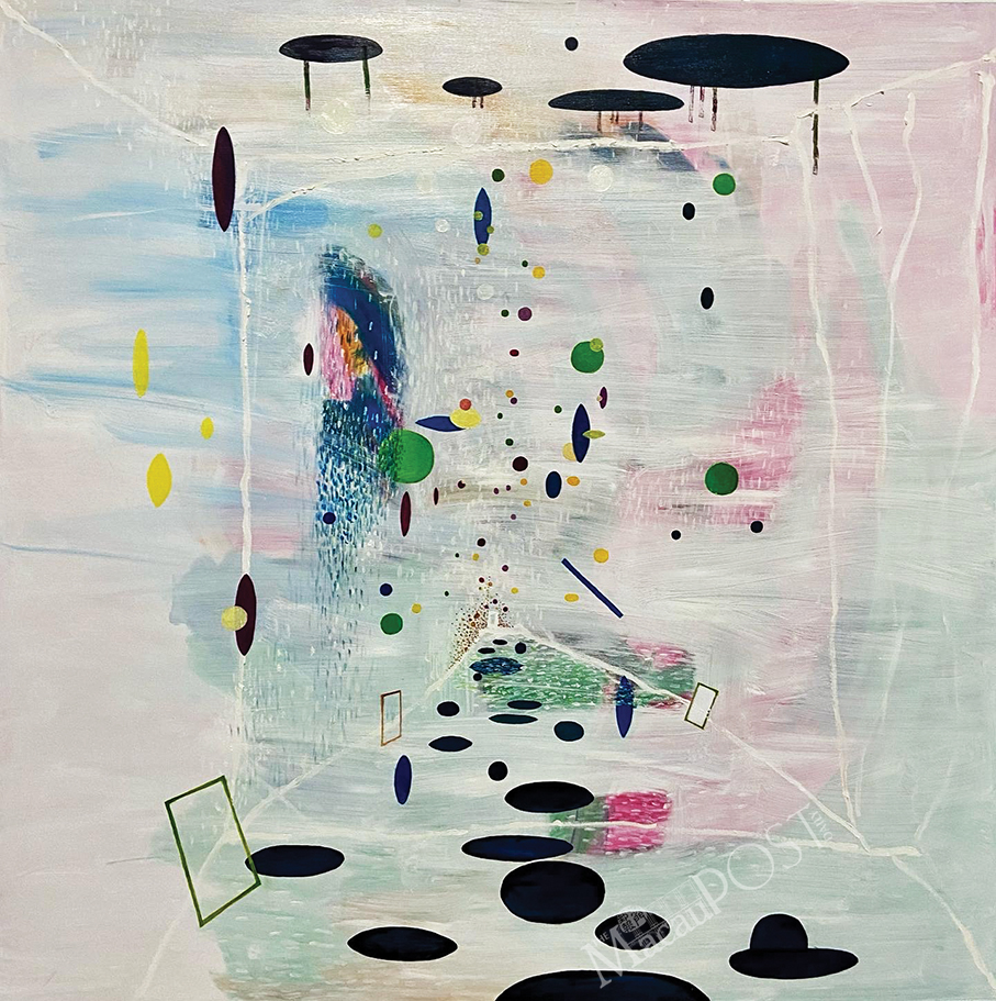 According to a recently provided Creative Macau statement, “Falling stripes, floating circles, geometrical shapes and seemingly recognisable and non-recognisable elements” stand out in the paintings and provide them with their “contemporariness”. The statement noted that the paintings’ atmosphere offers hints of coldness and spaces “detached from reality”, having no words or people while time seems to be paused.