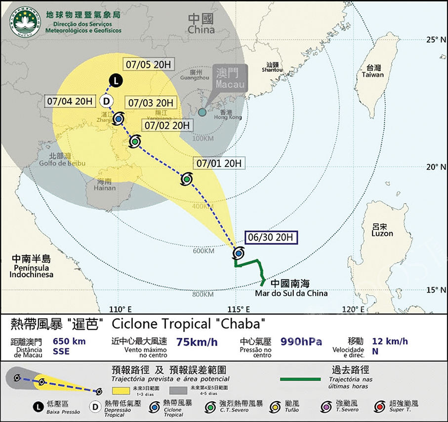 According to the observatory, a tropical storm (T.S.) named “Chaba” was 540 kilometres south-southeast of Macau at 3 a.m., which is moving towards the western coast of Guangdong province.