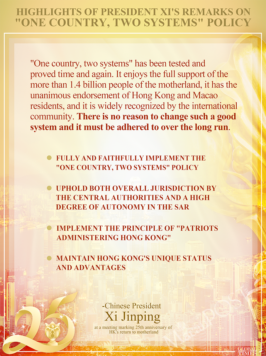 Over the past 25 years, with the full support of the country and the joint efforts of the HKSAR government and people from all walks of life in Hong Kong, the success of "one country, two systems" has won recognition throughout the world, Xi said."One Country, Two Systems" has been tested repeatedly in practice. It serves the fundamental interests of not only Hong Kong and Macau, but also the whole country and the nation. It has gained wide support from the 1.4 billion-plus Chinese people including the residents of Hong Kong and Macau. It is also widely accepted by the international community. There is no reason for us to change such a good policy, and we must adhere to it in the long run, Xi stressed.