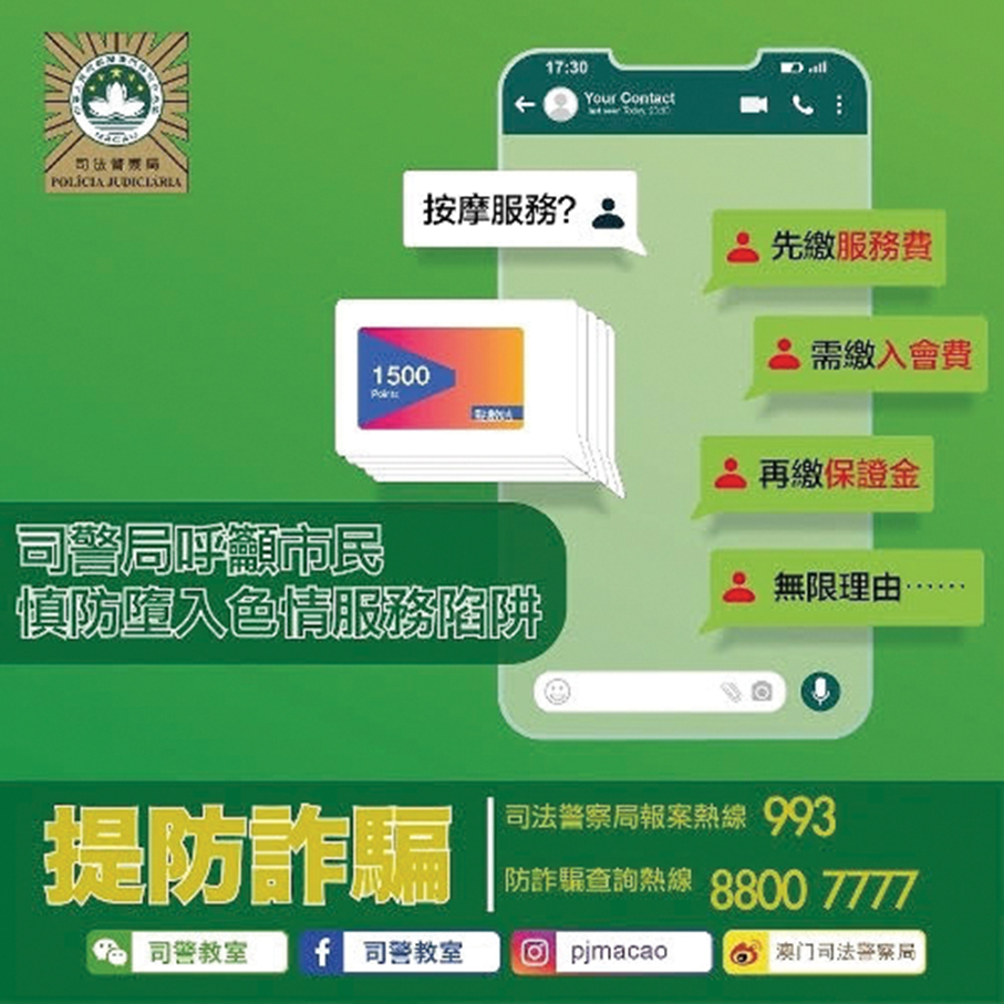 According to the statement, the police recently received separate reports from two residents that they got to know a “net friend” through a mobile social platform, who claimed that he or she could provide them a massage service, telling them that they needed to buy a game point card to pay for the service.