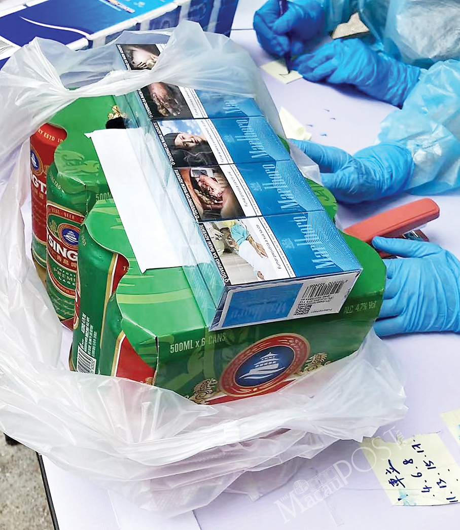 This undated handout photo provided by the Municipal Affairs Bureau (IAM) yesterday shows cigarettes and alcoholic beverages, both of which are considered non-urgent supplies to locked-down (“red zone”) buildings.