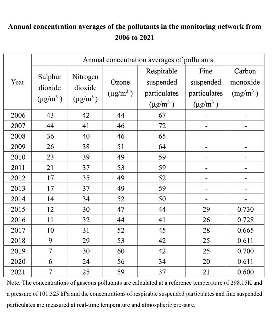 The statement noted that the regional air quality monitoring networks commenced operation in November 2005. Compared with 2006, the average annual concentration levels of sulphur dioxide (SO2), respirable suspended particulates (RSPs) and nitrogen dioxide (NO2) in 2021 decreased by 84, 45 and 40 percent respectively, it added.