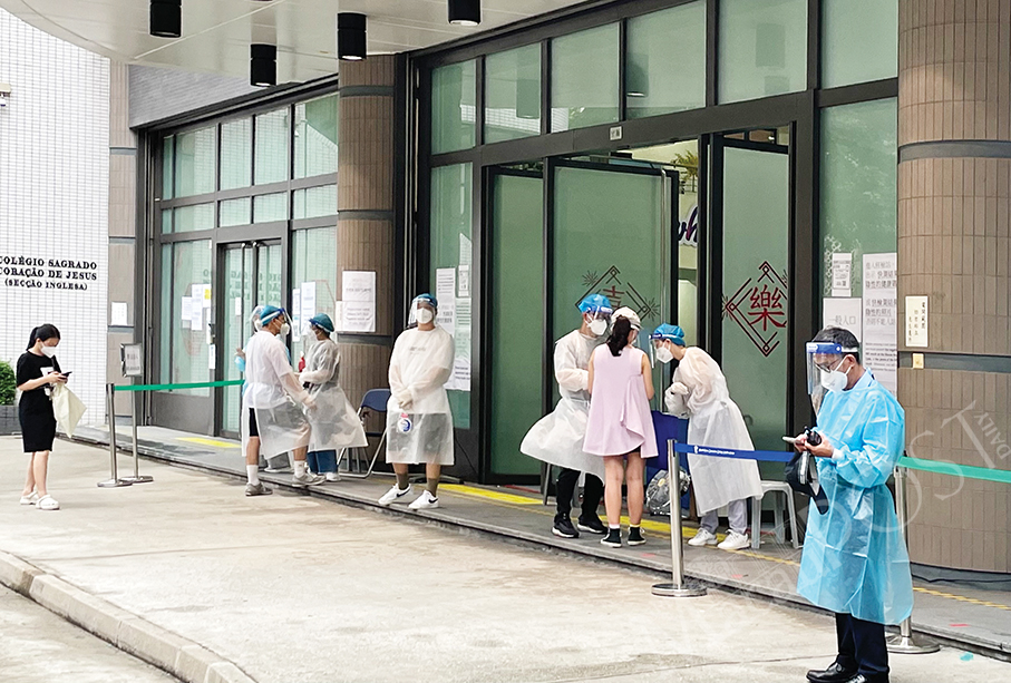 Nucleic acid test (NAT) station workers wearing protective clothing checking testees’ Macau Health Codes outside Sacred Heart Canossian College English Section yesterday. The Macau Post Daily’s vox pop was conducted near the station yesterday.