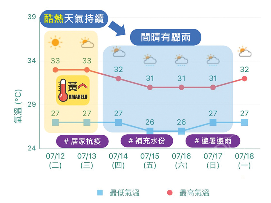 This infographic provided by the Macau Meteorological and Geophysical Bureau (SMG) yesterday shows the predicted temperatures above 31 degrees Celsius from today to next Monday.