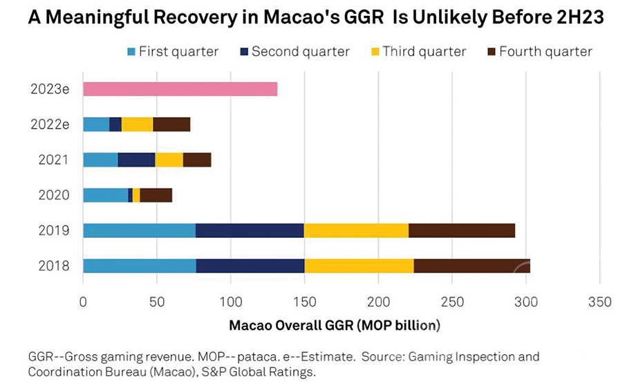 The US ratings agency predicts that Macau’s overall GGR this year will only reach 20-30 percent of 2019 levels, down from the previous forecast of 30-40 percent set at the beginning of the year, while Macau’s 2023 mass GGR forecast has been revised down to 50-70 percent of 2019 levels from the 80 percent forecast previously.