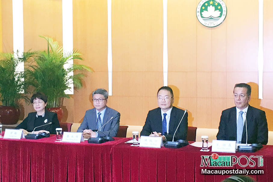 Education and Youth Affairs Bureau (DSEJ) Director Leong Lai (first from left), Sports Bureau (ID) President Pun Weng Ku (second from left), Government Information Bureau (GCS) Director Victor Chan Chi Ping (second from right) and Civic and Municipal Affairs Bureau (IACM) President Jose FonsecaTavares pose during yesterday’s press conference at Government Headquarters about next week’s visit by the nation’s gold medallists. Photo: Debby Seng