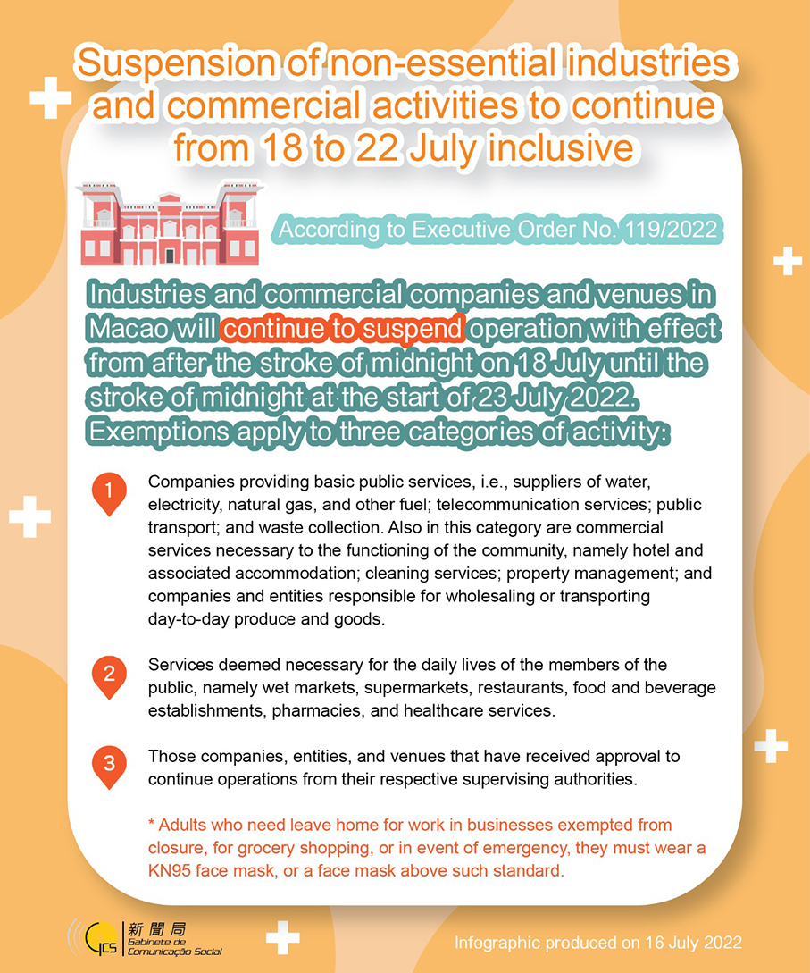 Today's order follows up on an order which imposed the measures on people's movement and businesses in Macau from 0:00 on Monday (July 11). Ho's original order promulgated on July 9 was slated to expire at 11:59 tomorrow.
