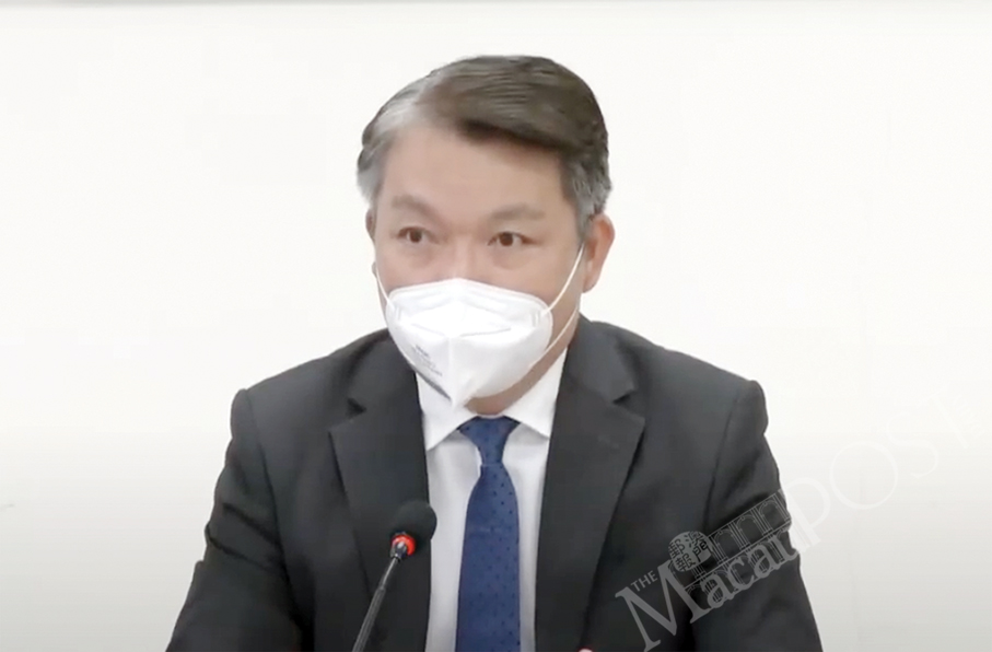 Secretary for Economy and Finance Lei Wai Long speaks during Saturday’s press conference about the government’s latest measures to tackle the city’s current COVID-19 outbreak. – Video grab from GCS