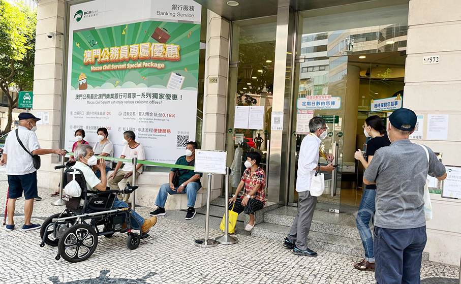 People queue outside a local bank branch earlier today. Banks in Macau reopened at noon today after a two-week government-ordered suspension due to its tightened COVID-19 prevention and control measures. – Photo: MPDG