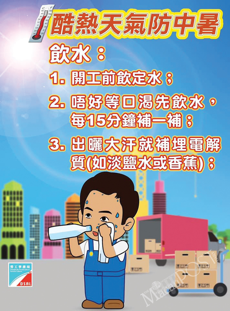 This poster provided by the Labour Affairs Bureau (DSAL) yesterday urges workers to take precautions to protect themselves from heatstroke.