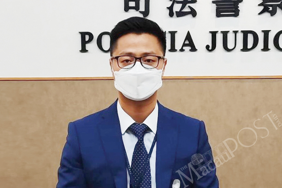 Judiciary Police (PJ) spokesman Leng Kam Lun looks on during yesterday’s regular press conference at the PJ headquarters in Zape. Photo: William Chan