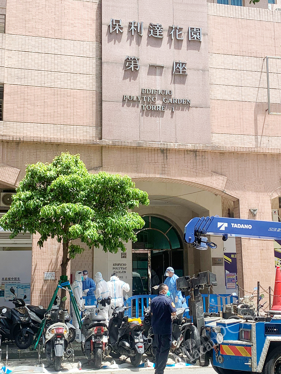 Caption: Health workers and police officers seal off Block 1 of Polytec Garden in the Macau peninsula's Areia Preta district this afternoon. – Photo: MPDG
