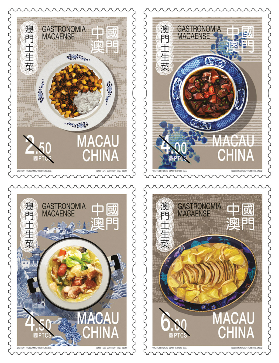 The stamps were designed by Victor Hugo Marreiros, with the information brochure’s text written by the Macanese Association. This issue includes a set of four stamps and one souvenir sheet, with images illustrating five culinary delights chosen from the Macanese Cuisine Database.