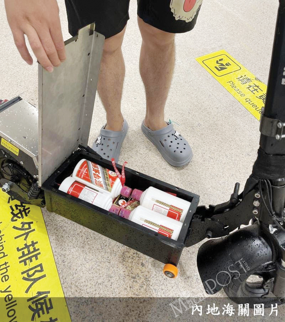 Meanwhile, a local man, who was pushing an electric scooter, was intercepted by customs officers when he entered the mainland through the “nothing to declare” channel at Qingmao checkpoint around 12:30 a.m. yesterday, another statement by the customs administration said yesterday, adding that five bottles of Maotai liquor were found in a hidden compartment under the front basket and the deck of the scooter.