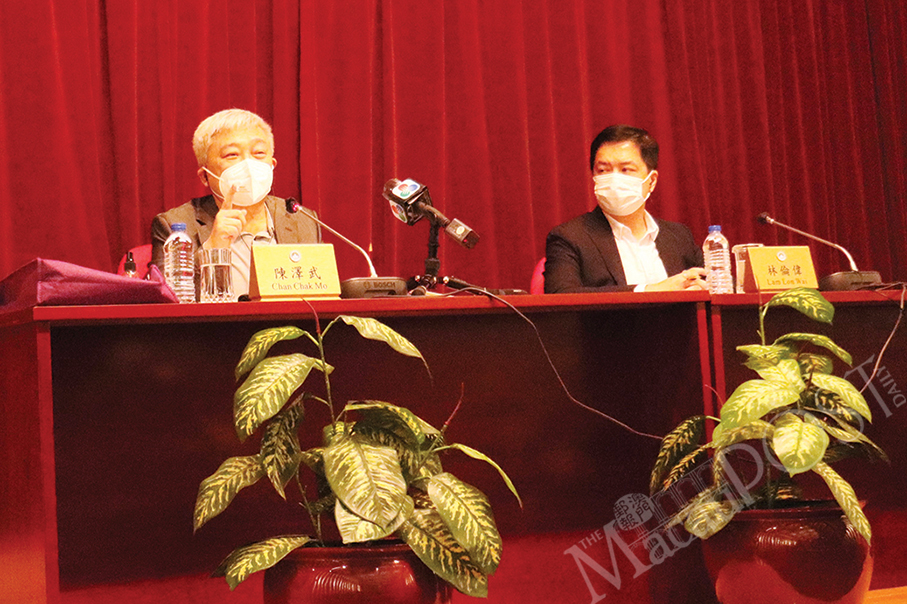 Lawmaker-cum-restaurateur Andrew Chan Chak Mo (left), who chairs the legislature’s 2nd Standing Committee, talks to reporters yesterday after the committee’s closed-door meeting reviewing the government’s junket bill, as the committee’s secretary, Lam Lon Wai, looks on. – Photo: Ginnie Liang