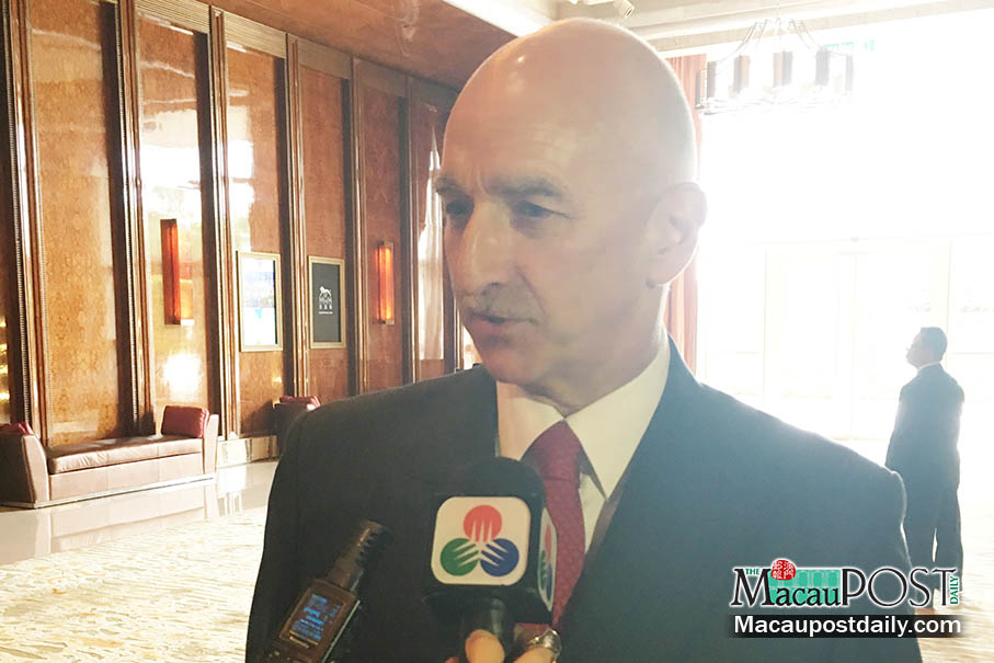 CEO and Executive Director of MGM China Holdings Grant Bowie talks to reporters on the sidelines of a forum about economic development in the mainland and Macau, hosted by the US gaming company at its Zape property yesterday. Photo: Debby Seng