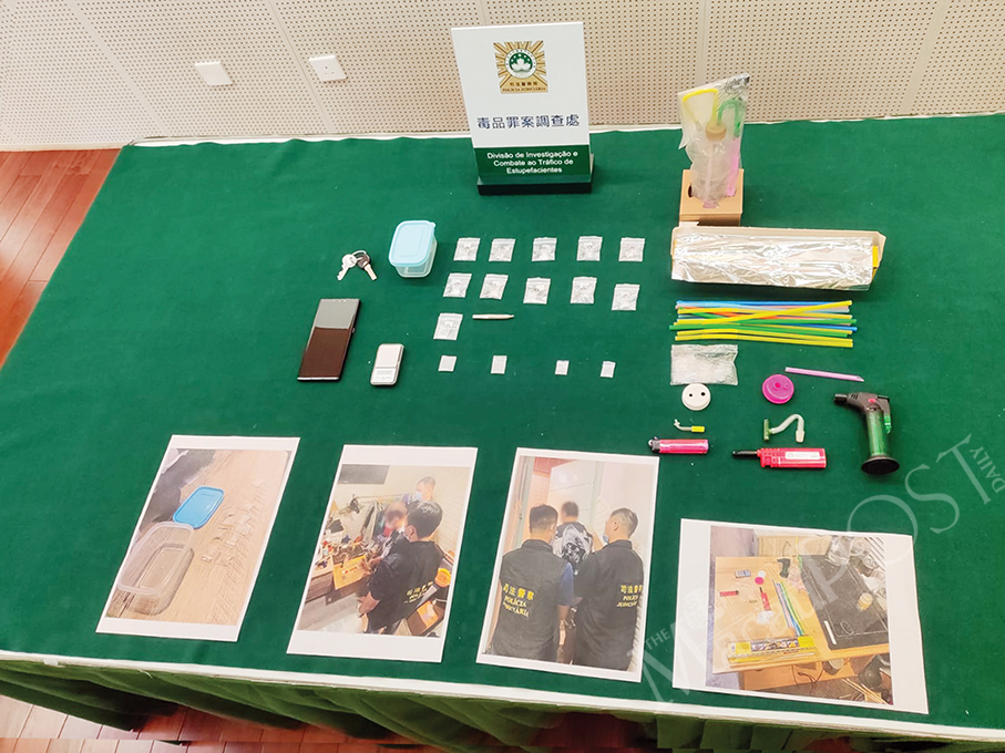 According to Lei, the police searched Peng’s flat in San Kio district later and found 11 small packs of ice (aka crystal meth) weighing a total of 5.46 grammes, a joint (aka rolled cannabis cigarette) weighing 0.35 grammes, as well as electronic scales. Lei noted that the drugs have an estimated street value of 18,000 patacas.