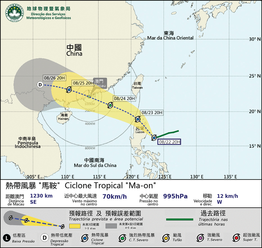 The Meteorological and Geophysical Bureau (SMG) forecast on its website yesterday that Tropical Storm “Ma-on” will come closest to the coast of Guangdong province between tomorrow evening and Thursday, which may have a “significant” impact on the Pearl River Delta (PRD) and strengthen winds in Macau, combined with heavy squally showers and thunderstorms.