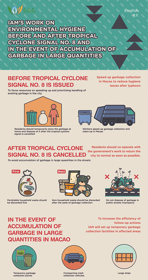 The Municipal Affairs Bureau (IAM) said in a statement yesterday that with the approaching Tropical Storm “Ma-on” and expected unstable weather, it has cooperated with Macau Residue System Company, Ltd. (CSR) to develop a preliminary plan for the rubbish clearance work before and after the storm, urging members of the public to cooperate.