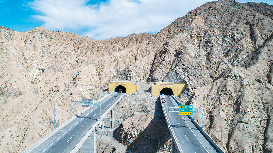 This aerial photo taken on June 11 shows two tunnels along a section of the Yetimbulak-Ruoqiang expressway in the Xinjiang Uygur Autonomous Region. The new expressway passage that links northwest China’s Xinjiang Uygur Autonomous Region opened to traffic last Tuesday. It aims to further facilitate the travel and boost high-quality development of local economy. Stretching about 300 kilometers, the expressway, linking Yetimbulak township and Ruoqiang county, is an important part of the country’s expressway network. With a designed speed of 120 km per hour, it is the third expressway connecting Xinjiang with places outside of the region. – Xinhua