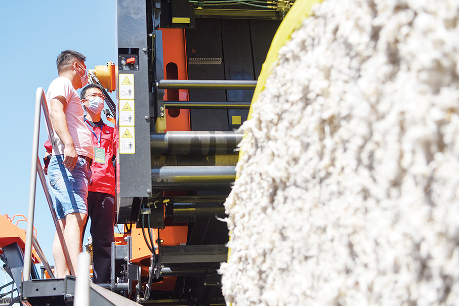 Fairgoers check out a cotton picker at an agricultural machinery expo in Urumqi, capital of the Xinjiang Uygur Autonomous Region, on July 3, 2022. The expo was held at the Xinjiang International Convention and Exhibition Center in Urumqi from July 3 to 5. – Xinhua