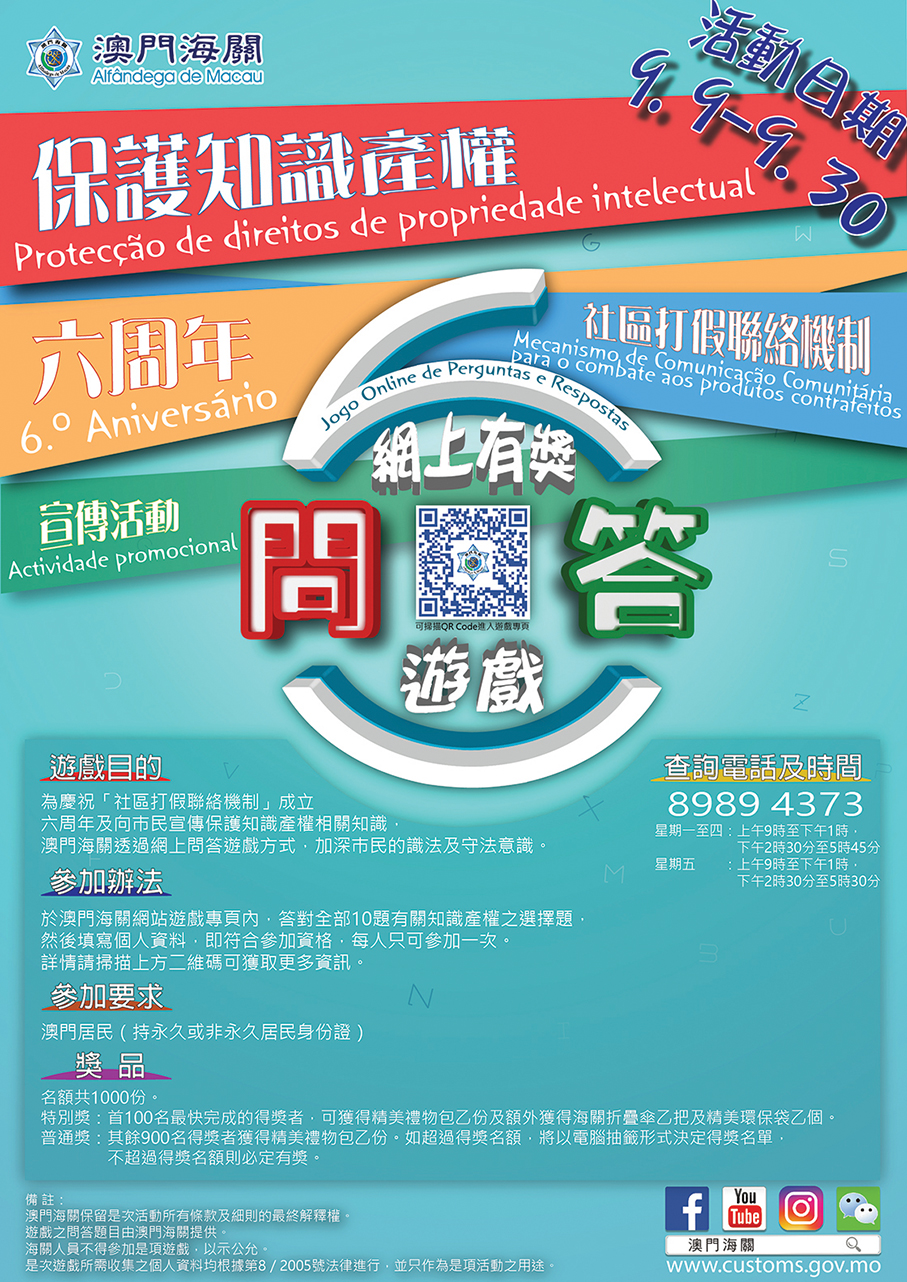 A statement by the Macau Customs Service (SA) yesterday said that in order to continuously enhance public awareness of intellectual property (IP) protection, it is hosting an online quiz competition entitled “Protect Intellectual Property Rights (IPR)”, which will be held from 10 a.m. this Friday to 5 p.m. on September 30 for all local residents.