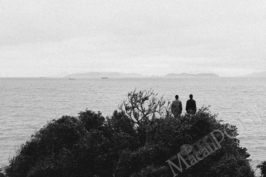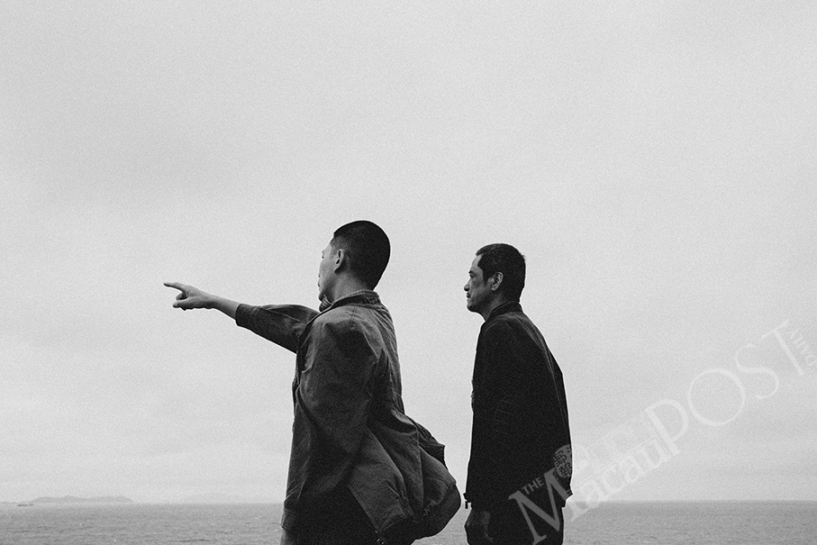 The protagonist played by Lai Nai Hang (left) and the car mechanic played by Chan Sai Peng survey the sea in Coloane on March 8. Photo provided by Chan Chon Sin