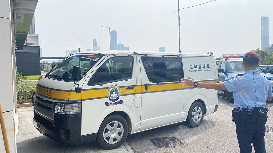 A Correctional Services Bureau (DSC) van enters the Court of First Instance (TJB) building’s car park near Sai Van Lake before yesterday afternoon’s trial of former gaming junket magnate Alvin Chau Cheok Wa. – Photo courtesy of TDM
