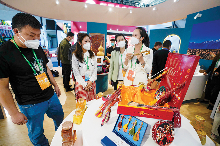 Fairgoers look at traditional Uygur instruments at the 7th China-Eurasia Expo in Urumqi, capital of the Xinjiang Uygur Autonomous Region yesterday. The four-day fair ends today. – Xinhua