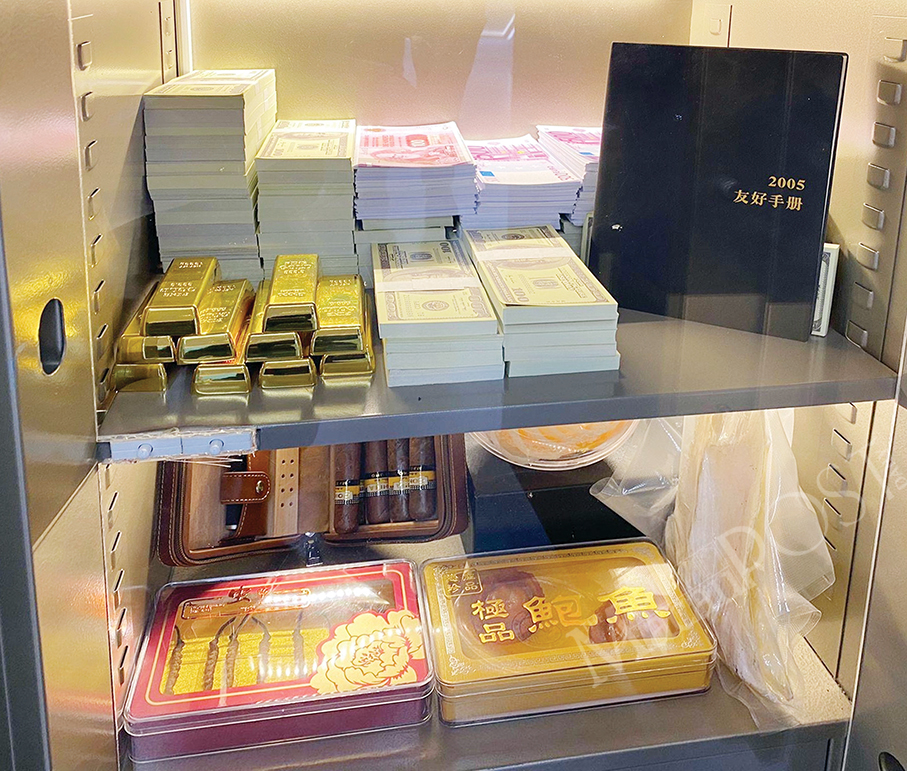 This photo taken yesterday shows mock evidence from ex-secretary for transport and public works Ao Man Long, such as gold bars, cash in various currencies and dried abalone, displayed in a safe in the multi-media exhibition area at the Commission Against Corruption’s (CCAC) Taipa Community Office which also includes a new Integrity Education Base. – Photo courtesy of TDM
