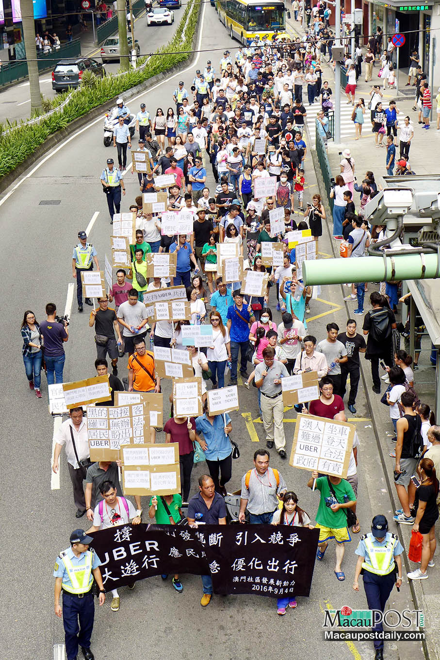 Participants in a protest rally yesterday in support of Uber urged the government to introduce “more choices” of public transport to Macau and authorise Uber’s ride-hailing app service.