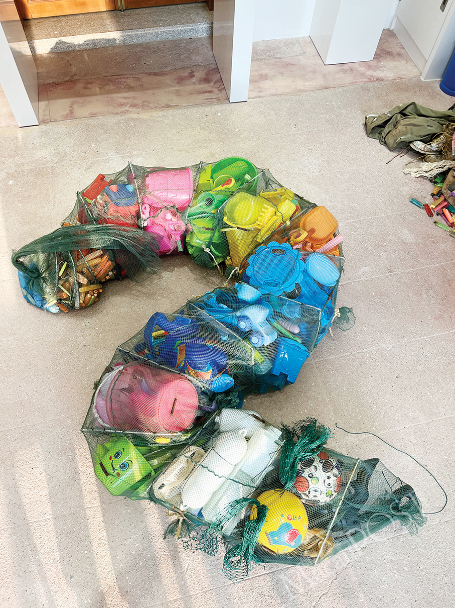 The objects used to create the artworks include fishing nets, tree trunks, beach toys and lost objects washed up or unearthed during storms, among others, the statement said.